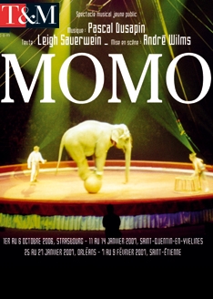 MOMO spectacle musical jeune public musique : Pascal Dusapin mise en scène : André Wilms décor : Nicky Rieti Commande de T&M (version pour récitant et quatuor instrumental) Texte : Leigh Sauerwein, préparation musicale : Philippe Nahon, lumière : Bernard Jamond, costumes : Elisabeth Tavernier, assistante à la mise en scène : Frédérique Michel avec : Richard Dubelski (récitant) et un quatuor instrumental (violon, violoncelle, clarinette, mandoline/guitare) production : T&M coproduction 2002 : Carré Saint-Vincent/Scène Nationale d'Orléans, Maison de la Culture d’Amiens, Ensemble Ars Nova, Opéra en Ile de France, avec le soutien de l’Adami et de la Spedidam. spectacle créé le 19 novembre 2002 à Nanterre, Saison jeune public (Richard Dubelski, récitant, Fanny Paccoud, violon, Robin Clavreul, violoncelle, Marina Moth, clarinette, Florentino Calvo, mandoline/guitare). durée du spectacle : 40 mn |